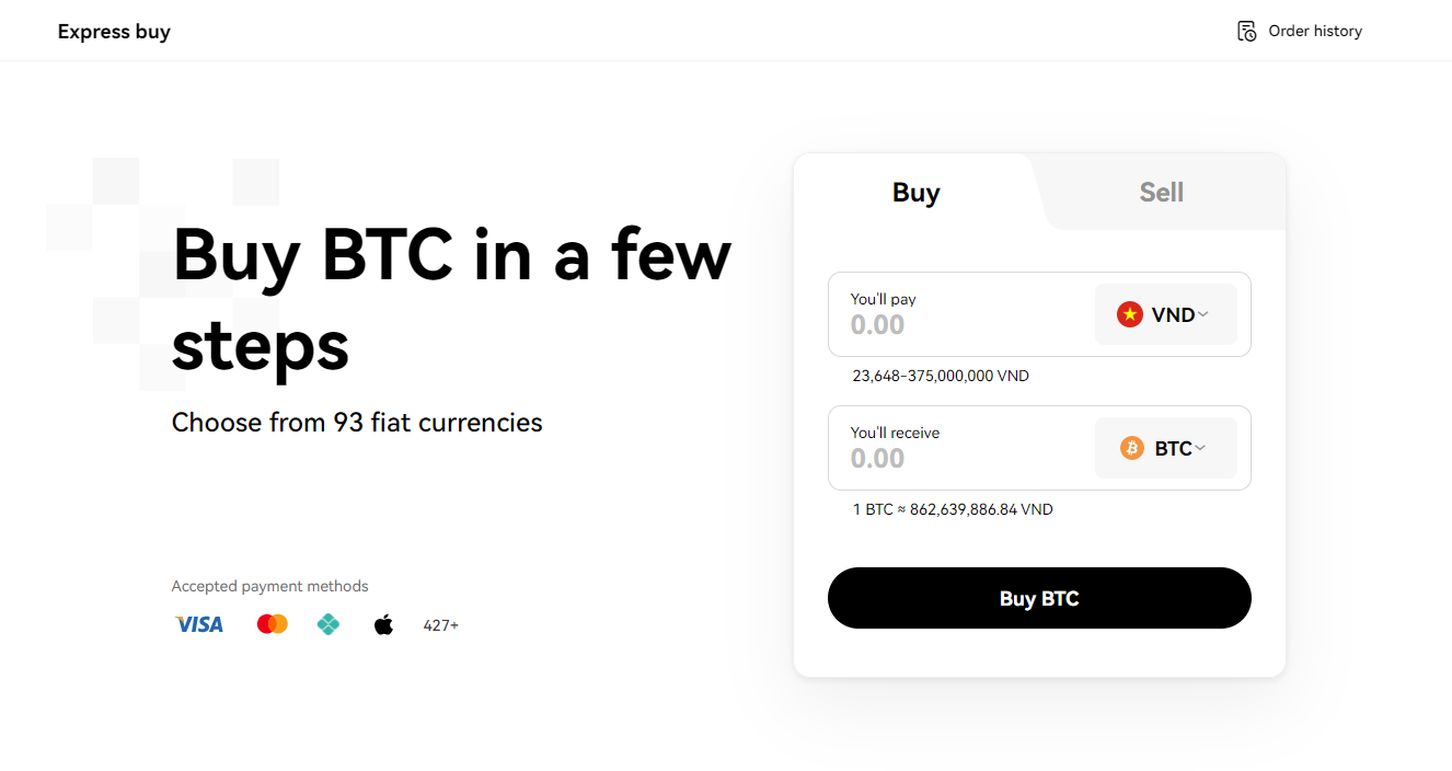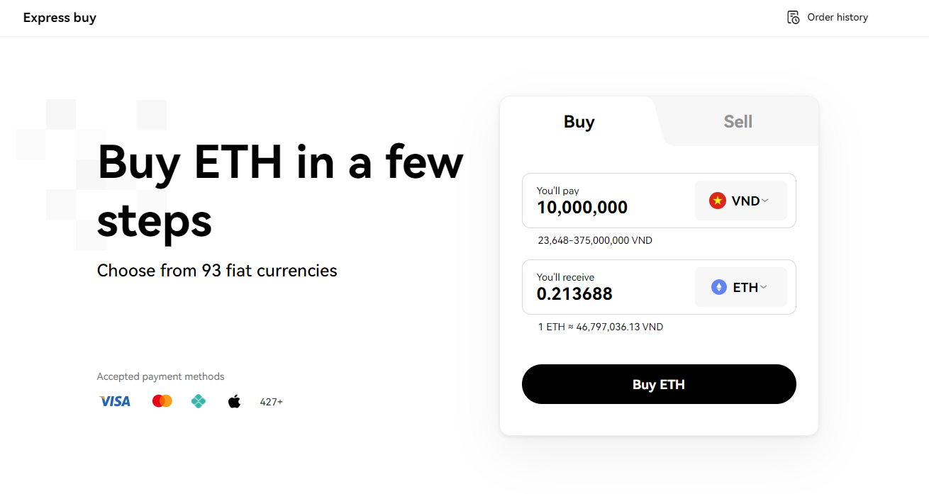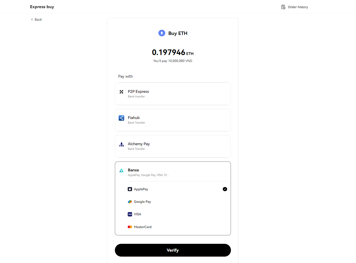 Tiếp đến, tại mục “Buy crypto” bạn chọn “Express buy”. Với lựa chọn này, bạn có thể thực hiện mua ETH bằng thẻ tín dụng, ghi nợ của Visa và Mastercard.