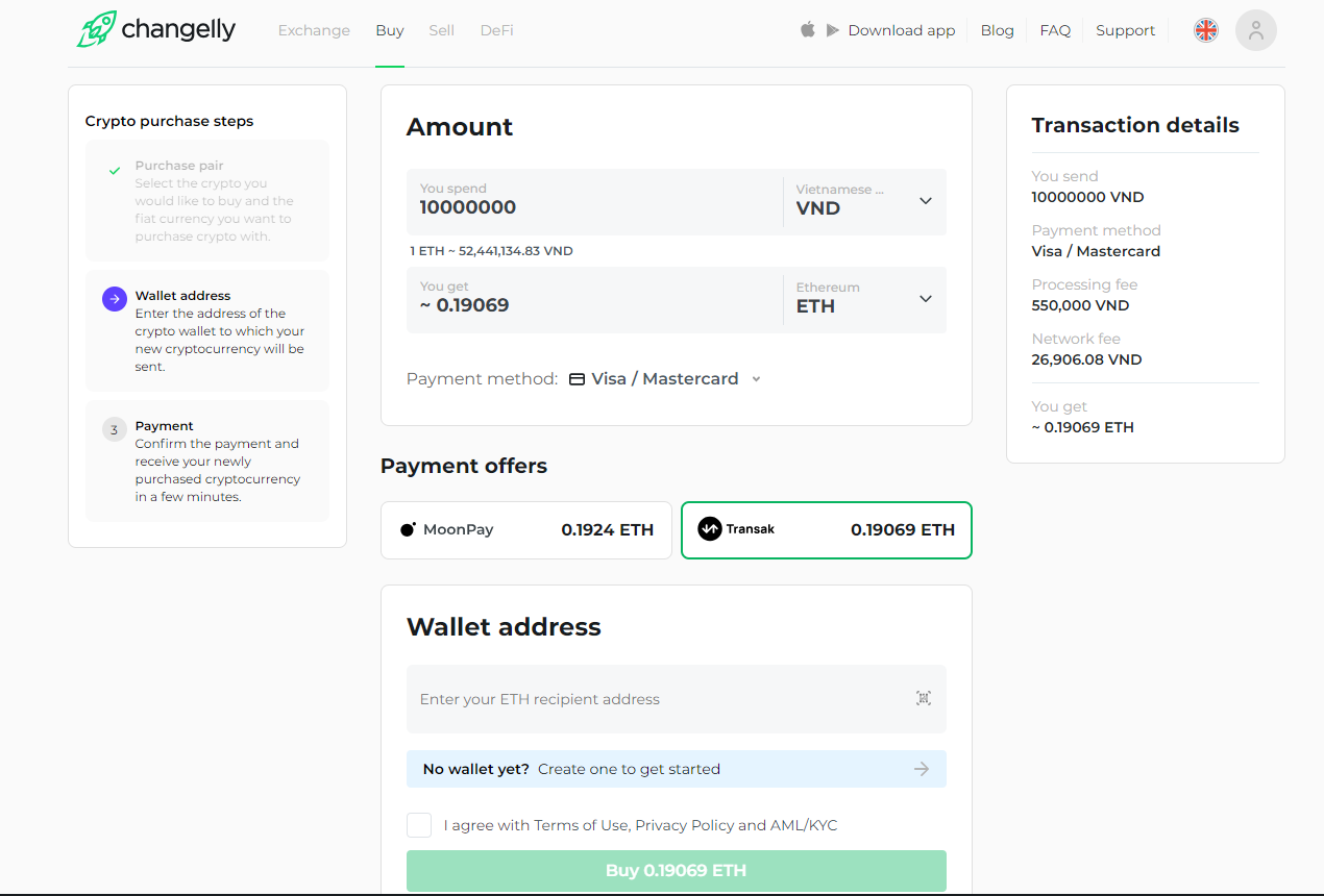 Lúc này, Changelly sẽ liệt kê các cổng thanh toán được hỗ trợ (ví dụ MoonPay hoặc Transak). Cả hai hình thức này đều hỗ trợ Visa/Mastercard. Bạn sẽ thấy chi tiết cho từng giao dịch ở bên và số lượng ETH cuối cùng bạn sẽ nhận được. Nếu đồng ý, bạn chọn Buy ETH để tiến hành giao dịch mua ETH trên Changelly bằng thẻ tín dụng, thẻ ghi nợ.