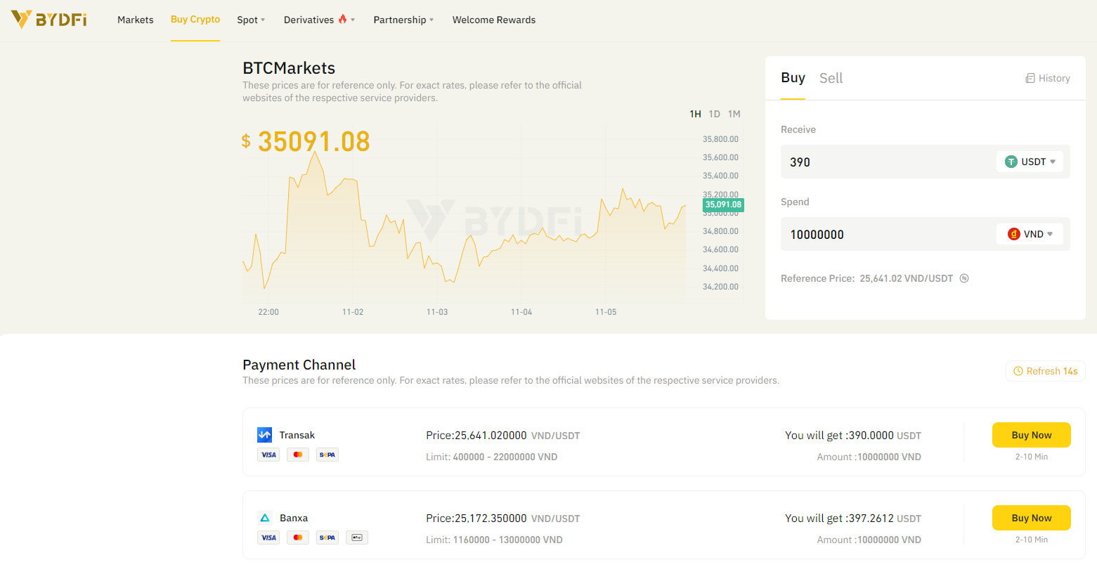 Để mua ETH trên sàn BYDFi bằng thẻ tín dụng, ghi nợ, bạn truy cập vào đường link của sàn tại địa chỉ https://www.bydfi.com/. Tương tự, bạn cũng tiến hành đăng nhập để có thể bắt đầu quá trình mua bán.
