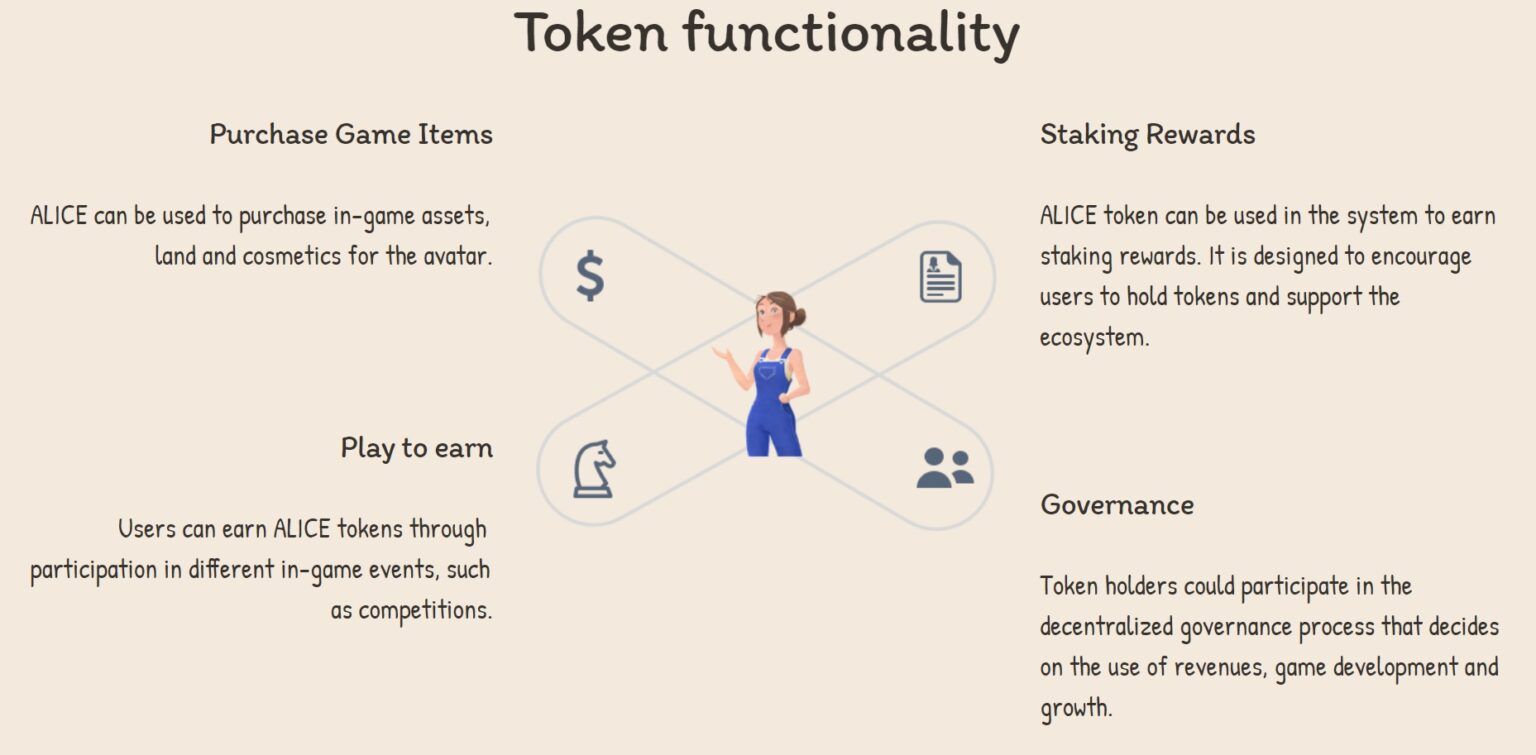 ALICE coin có thể được sử dụng để mua các vật phẩm trong trò chơi. Ngoài ra, ALICE có thể sử dụng trên thị trường NFT của dự án và người dùng có thể mua các nhân vật trong trò chơi, cũng như mở khoá mótoos tính năng khác trong game.