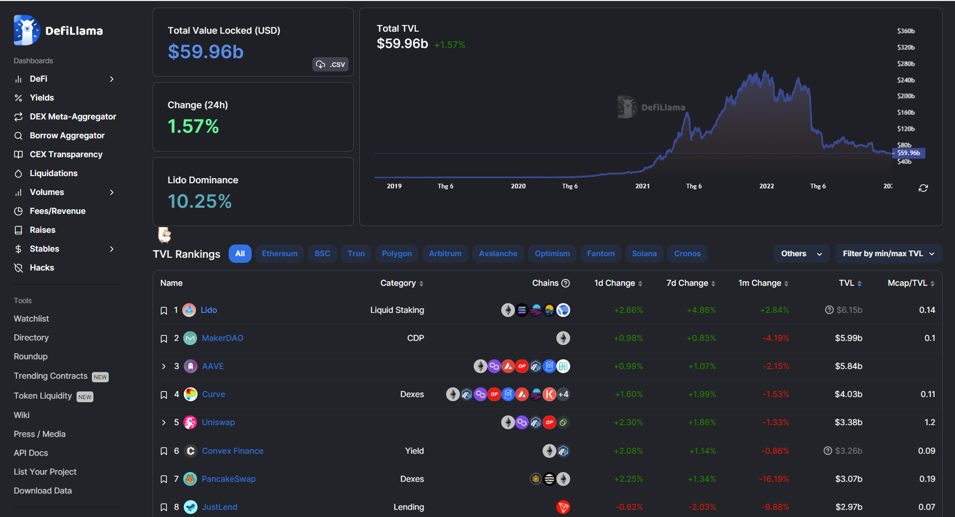 DeFiLlama là một website tổng hợp dữ liệu cho các ứng dụng trên DeFi và là trang web tổng hợp về TVL của các Blockchain hàng đầu được nhiều nhà đầu tư sử dụng. Kho lưu trữ các dữ liệu của DeFiLlama theo dõi hơn 1955 giao thức DeFi từ hơn 145 chuỗi khối khác nhau. Thêm vào đó, DeFiLlama hiện theo dõi và phân tích cho khoảng 10 lĩnh vực trong DeFi và phân chia dữ liệu nghiên cứu (research) cho khoảng 20 mục khác nhau.
