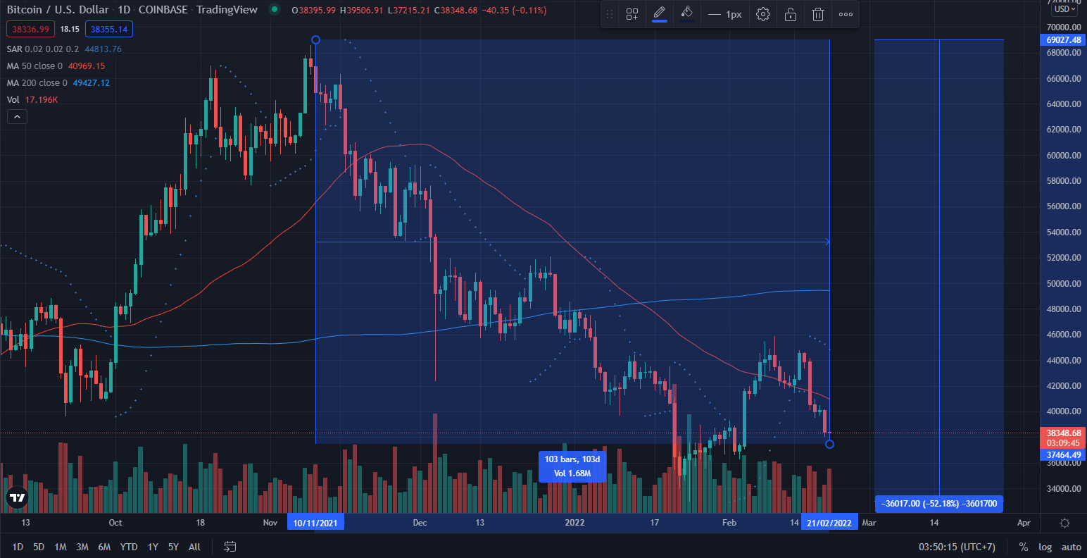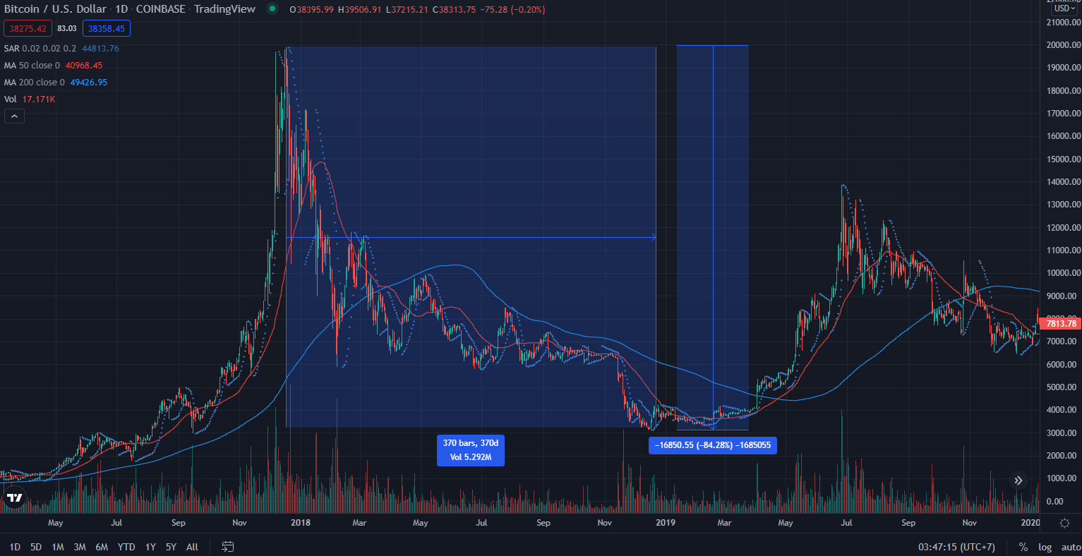 SponsoredQuay lại mùa đông Crypto năm 2018, chúng ta thấy rằng giá BTC mất khoảng 370 ngày để giảm từ mức đỉnh (19,800 USD) xuống mức thấp nhất (3,128 USD). Điều này đồng nghĩa với việc giá BTC mất khoảng 84% giá trị. Nếu tính từ mức đỉnh 69,000 USD được thiết lập hồi tháng 11/2021 đến bây giờ thì giá BTC đã mất khoảng 46% giá trị, trong khoảng thời gian 103 ngày. Nếu mùa đông Crypto 2022 thực sự đến, dựa theo dữ liệu lịch sử, giá BTC có thể giảm về mức 11,000 USD.