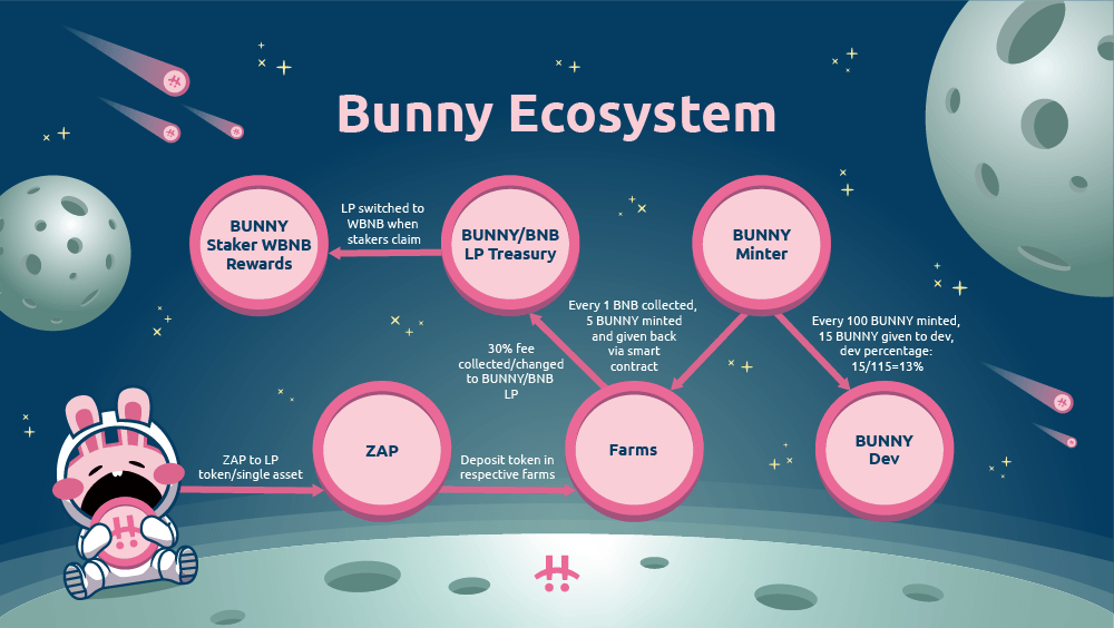 Người sở hữu BUNNY có thể tham gia stake BUNNY để nhận APY. Ngoài ra, holder BUNNY được hưởng token từ 30% của performance fee nếu tham gia stake BUNNY. Đối với thành viên trong hội đồng quản trị, những người nắm giữ BUNNY, có thể nhận được phần lớn lợi nhuận từ farm performance fee hoặc đặt cọc các token vào nhóm quản trị BUNNY và kiếm phần thưởng. Lợi nhuận được gửi đến hội đồng dưới dạng phần thưởng BNB. Số tiền lãi của mỗi cá nhân nhận được xác định bởi số lượng mã thông báo BUNNY mà họ đã stake.