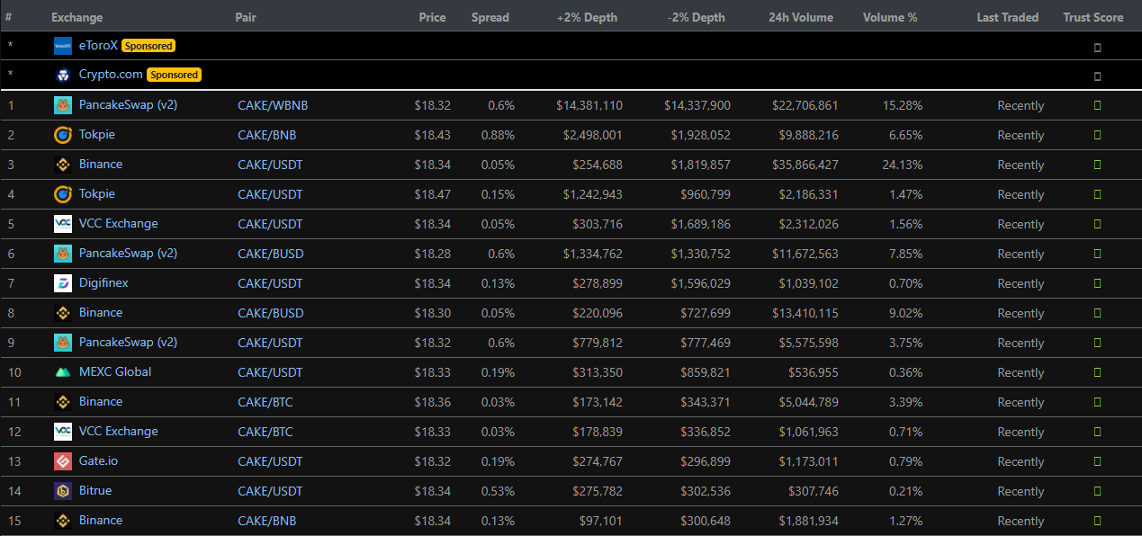 Hiện tại, CAKE được niêm yết tại rất nhiều sàn giao dịch lớn trên thế giới, trong đó bao gồm cả các sàn CEX và DEX. Hãy tham khảo một số sàn phổ biến như hình dưới đây.