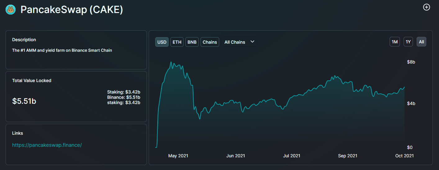 - Thứ nhất, đó là về tốc độ phát triển. Tính đến ngày 22/9/2021 vừa qua, dự án PancakeSwap tròn 1 năm tuổi. Sau một năm total volume khoảng 23.1 tỷ USD, average daily volume khoảng 770 triệu USD. Theo thống kê của DefiLlama, hiện PancakeSwap đang giữ top 1 trên mạng lưới BSC với TVL khoảng 5.51 tỷ USD. Khối lượng TVL này gần bằng với Uniswap mặc dù PancakeSwap ra mắt sau đó.