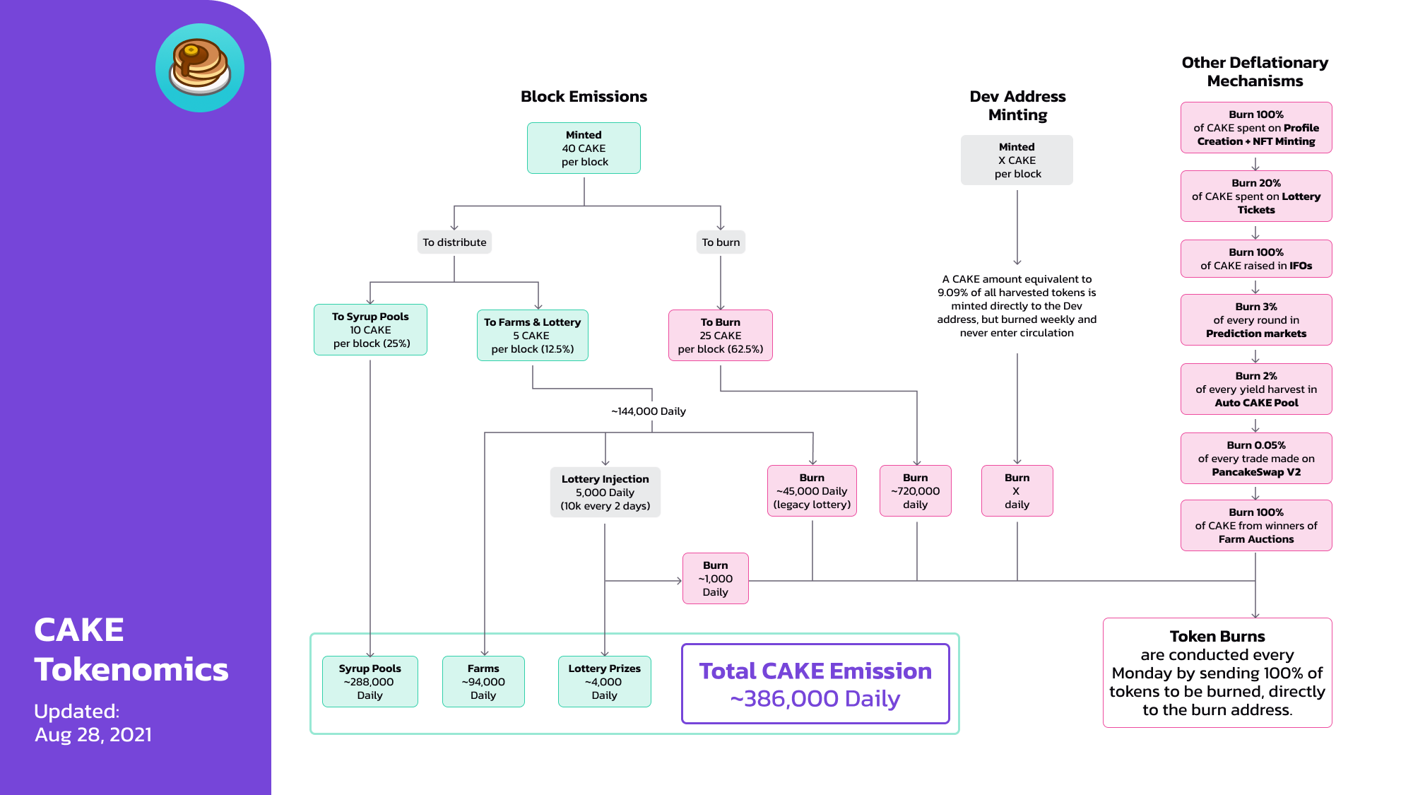 Tính đến thời điểm hiện tại, mỗi ngày có khoảng 386,000 CAKE mới được tạo ra. Con số này trước đây khoảng 530,000 CAKE. Lượng CAKE tạo mới hàng ngày này được phân bổ cho các sản phẩm của PancakeSwap như sau: