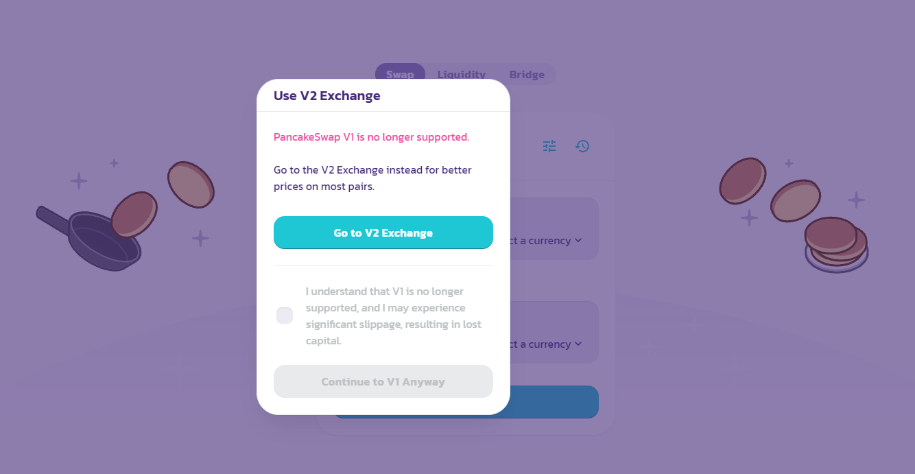 Lưu ý: Phiên bản PancakeSwap v1 hiện đã không còn được hỗ trợ. Do đó, người dùng buộc phải chuyển đổi sang sử dụng phiên bản v2.