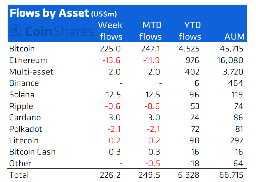 Ethereum (ETH) đã chứng kiến dòng tiền đầu tư giảm với tổng giá trị 13.6 triệu USD. Ethereum tiếp tục mất thị phần vào tay Bitcoin khi tỷ lệ AUM đã giảm 1% xuống còn 24% so với tuần trước. Một số altcoin top cũng được yêu thích tuần qua. Trong đó, Solana (SOL) đón nhận 12.5 triệu USD và Cardano (ADA) 3 triệu USD. Mặc dù dòng tiền đầu tư phần lớn chuyển vào Bitcoin nhưng dòng tiền vẫn chưa tập trung chưa hoàn toàn vào đây. Một số altcoin khác như Polkadot (DOT), Ripple (XRP) và Litecoin (LTC) có sự dịch chuyển giảm nhẹ tuần qua với dòng tiền đầu tư lần lượt là 2.1 triệu USD, 0.6 triệu USD và 0.2 triệu USD.