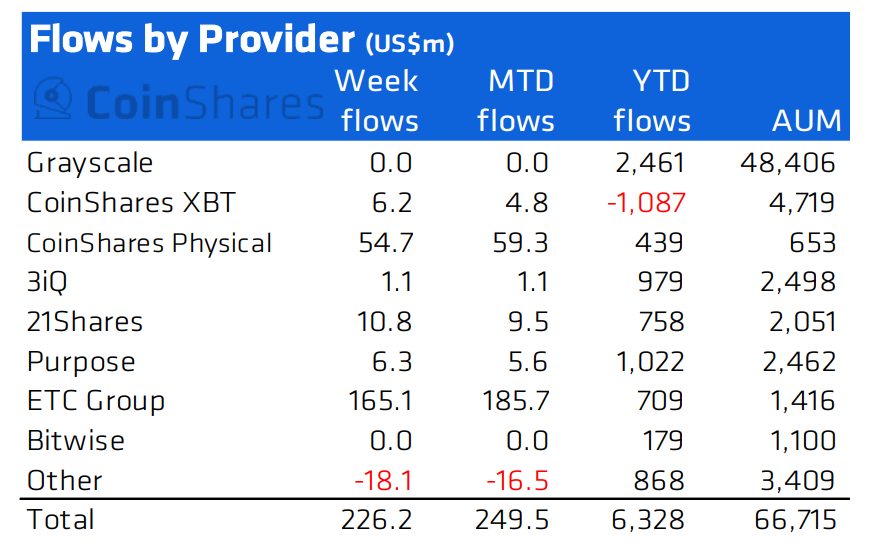 CoinShares Physical chiếm vị trí thứ hai trong tuần qua với việc thu mua hơn 54 triệu USD. Mức này tăng khoảng gần 5 lần so với tuần trước (ở mức 11.2 triệu USD). Hiện tại, CoinShares Physical hiện đang quản lý 653 triệu USD.
