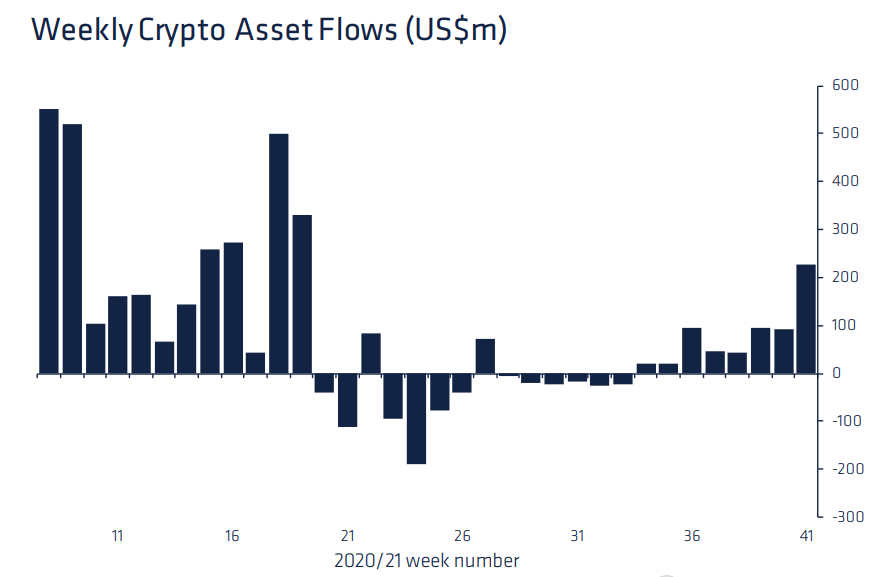 Bitcoin (BTC) đã chứng kiến dòng tiền vào tổng cộng 225 triệu USD, chiếm phần lớn trong dòng tiền đầu tư tuần qua. Có sự gia tăng đột biến này một phần dựa trên sự ủng hộ từ Chủ tịch SEC Gary Gensler về khả năng chấp nhận một Bitcoin ETF ở Mỹ. Mặc dù SEC đã hoãn lại thời gian xét duyệt với 4 đề xuất về Bitcoin ETF khác nhưng gần đây, SEC cũng đã chấp nhận Bitcoin ETF của Volt Equity. Mặc dù đây không phải là một quỹ ETF dựa trên Bitcoin thật sự nhưng đây cũng được xem như là một bước tiến đáng kể của Chính phủ Mỹ nói chung trong lĩnh vực này.