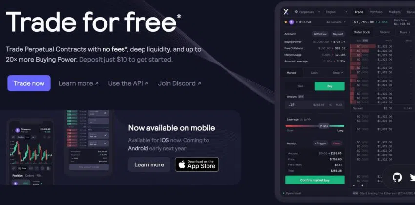 dYdX là một sàn giao dịch phi tập trung (DEX) hàng đầu trong ngành được xây dựng trên chuỗi khối Ethereum. Antonio Juliano, cựu kỹ sư của Coinbase và Uber, đã thành lập giao thức này vào năm 2017. dYdX là một trong những sàn giao dịch phi tập trung hàng đầu và là sàn giao dịch phái sinh hàng đầu dựa trên khối lượng giao dịch hàng ngày. Hơn thế, dYdX cung cấp giao dịch perpetual cho hơn 35 loại tiền điện tử phổ biến và giao dịch margin (ký quỹ).
