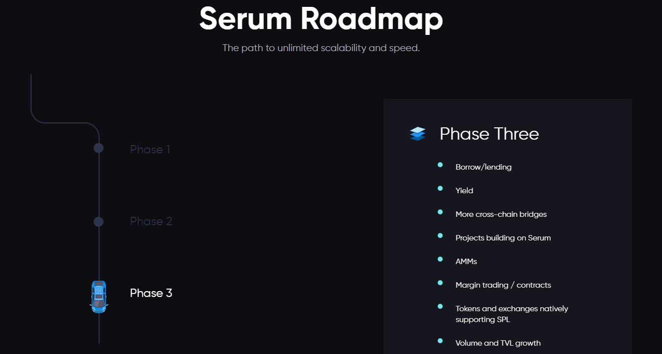 Lộ trình (roadmap) của Serum gồm 5 giai đoạn. Giai đoạn 1 thực hiện khởi chạy Serum token và Serum DEX. Giai đoạn 2 ra mắt cross-chain bridge trên Solana là Wormhole bridge (bridge này đã từng bị hack mất hơn 600 triệu USD trước đó), khởi động hệ sinh thái wallet và cấp vốn cho các dự án. Giai đoạn 3 là giai đoạn mở rộng các tính năng vay/cho vay và yield farming, xây dựng nhiều cross-chain hơn, xây dựng dự án trên Serum và giao dịch ký quỹ… Đáng chú ý, whitepaper của Serum đề cập đến hai token là SerumBTC (FBTC) và SerumUSD (FUSD) tương ứng với Bitcoin và USD. Đây là hai token được kỳ vọng là thực sự phi tập trung.