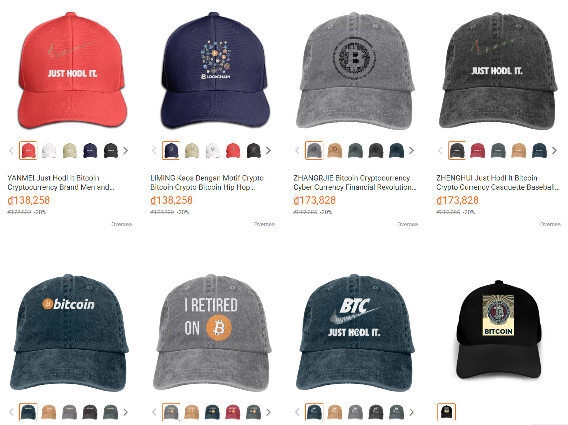 Bạn có thể tìm thấy trên trang thương mại điện tử Lazada rất nhiều những sản phẩm dạng như hình trên. Đó là những chiếc nón lưỡi trai có in hình chủ đề Bitcoin. Với những hình ảnh và câu nói cá tính, đúng chất của một dân Crypto. Như “Just hodl it!”.