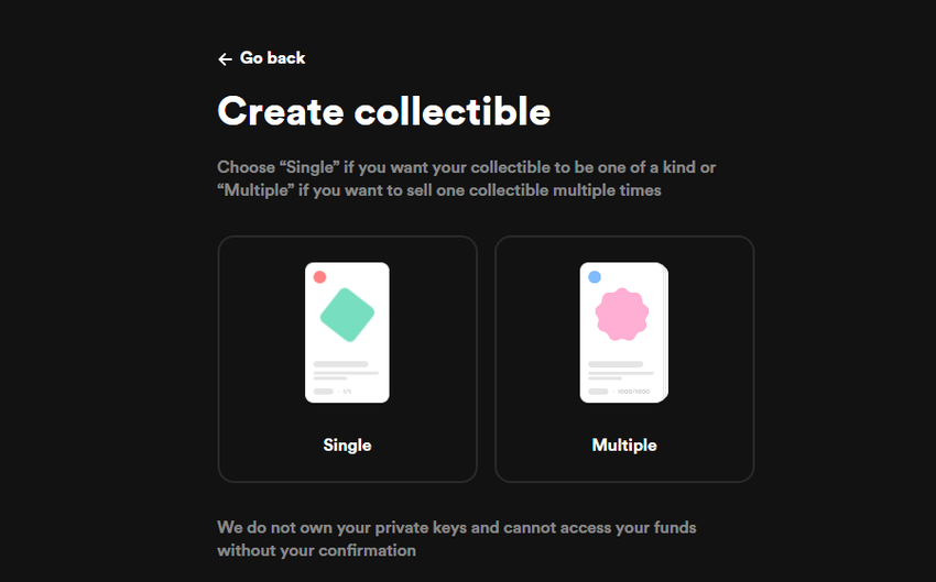 Sau khi kết nối, để tạo và bán NFT, chỉ cần nhấp vào “Tạo”. Thao tác này sẽ xuất hiện một cửa sổ mới hỏi bạn lựa NFT của mình là một hay nhiều bản. Tất nhiên, tác phẩm càng hiếm thì nguồn cung càng hạn chế, điều này có thể khiến giá của nó tăng cao. Giống như biệt danh của nền tảng “Rarible” ngụ ý.