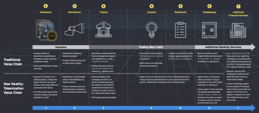 Xin lưu ý rằng việc đưa token được hỗ trợ bởi RWA ra thị trường bao gồm sự kết hợp phức tạp giữa các cân nhắc về kỹ thuật, pháp lý, quy định và kinh tế. Tuy nhiên, bất kể quy trình phức tạp đến mức nào, toàn bộ quy trình đều bắt đầu bằng ý tưởng mã hóa và chuyển sang lưu trữ an toàn và cung cấp các dịch vụ tài chính bổ sung, nếu cần. Và nếu điều đó trông giống với chuỗi giá trị truyền thống thì đồ họa thông tin dưới đây cho thấy sự khác biệt, tất cả là nhờ việc loại bỏ người trung gian.