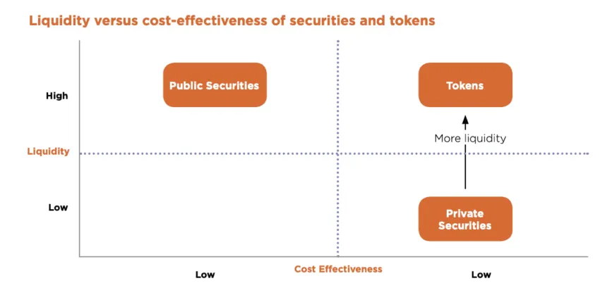 Nói một cách đơn giản, việc mã hóa các tài sản trong thế giới thực sẽ chuyển chúng từ khu vực có tính thanh khoản thấp và chi phí cao sang không gian có tính thanh khoản cao và chi phí thấp. Ngoài ra, sẽ có ít gánh nặng hành chính hơn phải giải quyết khi chứng khoán và các tài sản có tính biến động cao khác được token hóa vào không gian DLT/Blockchain.