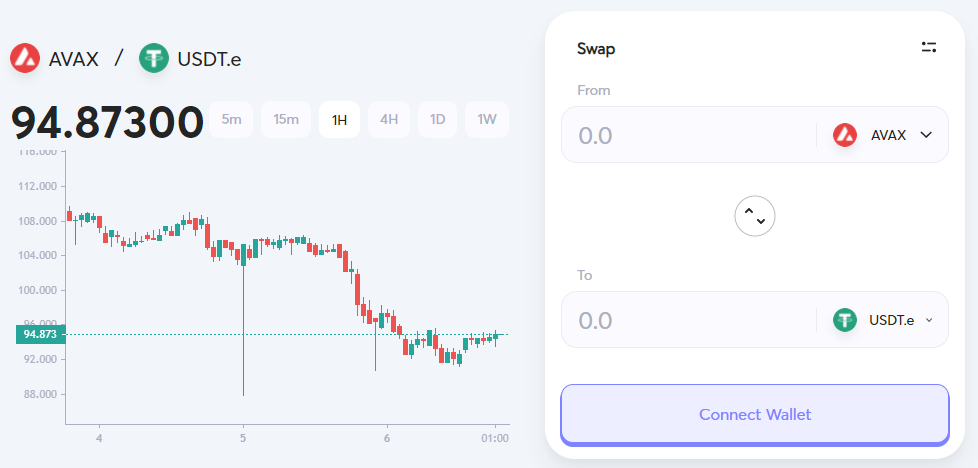 - Swap: Vẫn là tính năng hoán đổi thông thường nhưng Trader Joe tích hợp thêm phần biểu đồ nến. Điều này giúp người dùng có cái nhìn trực quan hơn về biến động giá của cặp tiền họ chuẩn bị giao dịch.