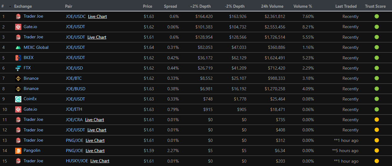 - Sàn giao dịch: Hiện nay JOE coin có thể được giao dịch trên một số sàn DEX như Pangolin, Trader Joe hay các sàn CEX như Gate.io, Binance, CoinEX,…