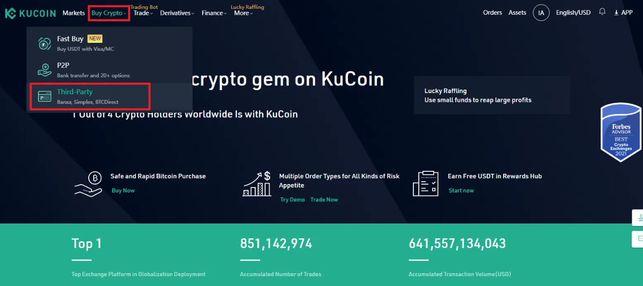 - Nếu bạn muốn mua tiền điện tử bằng thẻ tín dụng hoặc thẻ ghi nợ, hãy truy cập trang chủ KuCoin và nhấp vào “Buy Crypto” ở đầu trang. Sau đó chọn “Third-party”.