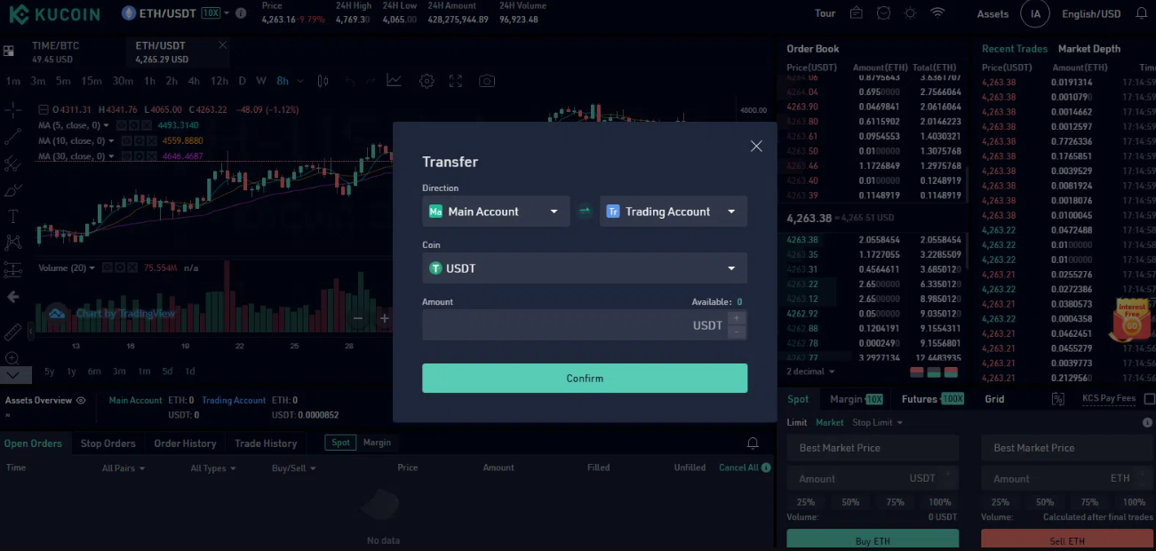 - Sau đó thực hiện chuyển tiền vào tài khoản giao dịch. Bạn chỉ cần nhấp vào “Transfer” và chọn loại coin muốn chuyển, sau đó nhấn “Confirm”.