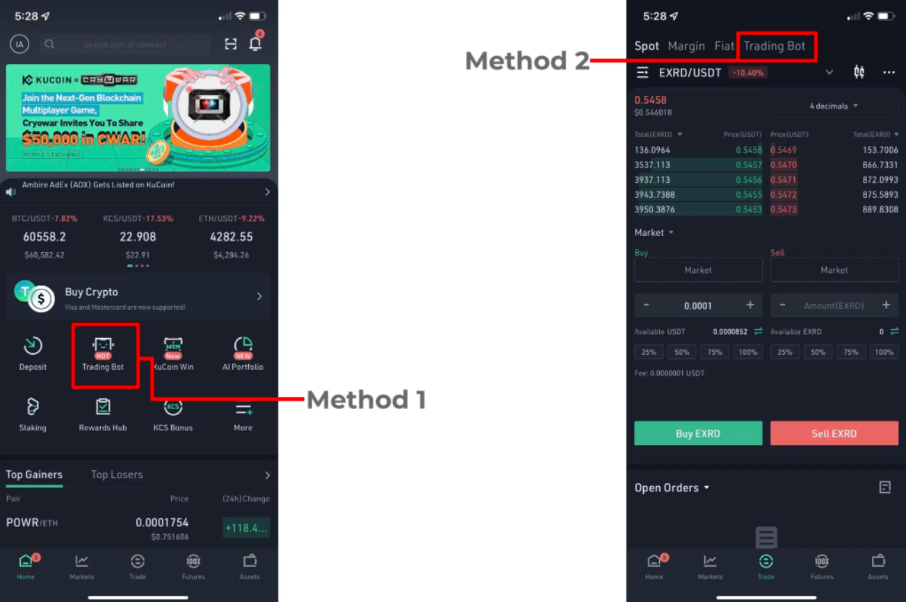 - Cách 2: Mở app KuCoin, chọn giao dịch, sau đó chọn trading bot.