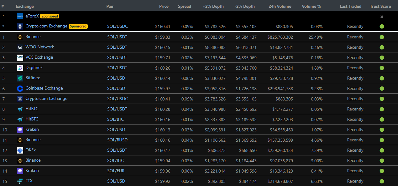 Hiện tại, đồng SOL đã được list lên rất nhiều sàn giao dịch lớn trên thế giới. Trong đó, Binance và Coinbase đóng góp phần lớn khối lượng giao dịch hàng ngày.
