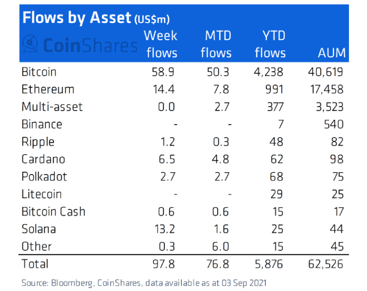 Không dừng lại ở đó, các NĐT tổ chức đã bắt đầu chú ý đến dự án này. Bằng chứng là lượng tiền đổ vào dự án đang ngày càng gia tăng. Theo thống kê từ CoinShares, lượng tiền đổ vào Solana tăng từ 13,2 triệu USD lên 49,4 triệu USD tuần qua.