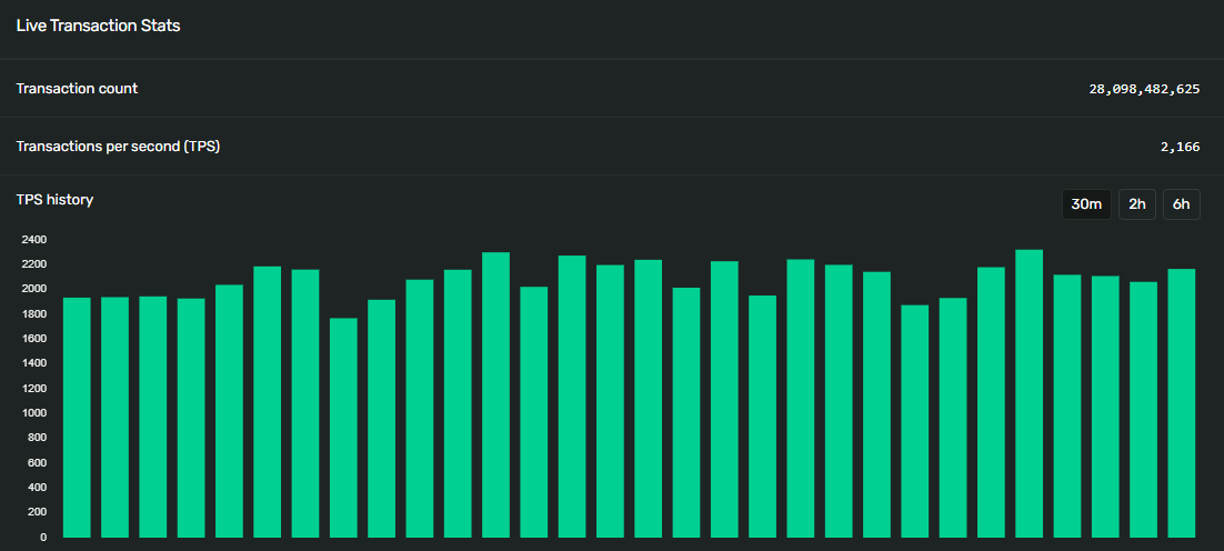 Nếu như mạng lưới Bitcoin mỗi giây xử lý được từ 1-3 giao dịch (TPS), Ethereum là 15-20 TPS thì Solana đã vượt xa con số đó. Như hình trên chúng ta thấy, một block bình thường nó đã xử lý được hơn 2.000 TPS. Thậm chí, gần đây, khi mạng lưới Solana gặp vấn đề, TPS đã tăng vọt lên 400.000.