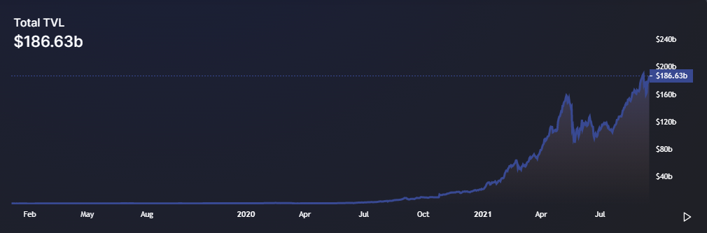 - Thứ nhất, đúng thời điểm: Dự án Solana ra đời vào khoảng tháng 5/2020. Đây là trùng với thời điểm thị trường DeFi đang dần nóng lên từng ngày. Tại thời điểm đó, TVL của toàn thị trường DeFi đạt chưa tới 1 tỷ USD. Nhưng ngay sau đó, thị trường nóng lên, vốn đổ vào các giao thức DeFi ngày một nhiều. Và đến nay, gần 190 tỷ USD đã bị khóa trong các giao thức DeFi.