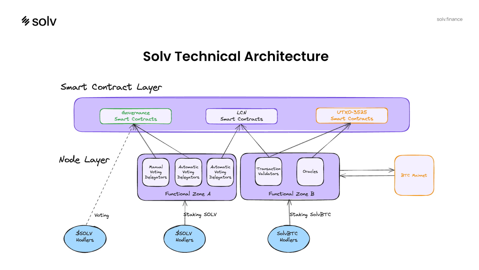 - UTXO-3525: Solv Protocol triển khai UTXO-3525. Đây là một giao thức ánh xạ các giao dịch Bitcoin theo tiêu chuẩn ERC-3525, cho phép chuyển các tài sản liên quan đến Bitcoin như BTC, Ordinals và Runes từ mạng Bitcoin sang các mạng tương thích với EVM. Nói đơn giản thì UTXO-3525 sẽ đóng vai trò trung gian, tương tự như cách chuyển đổi từ BTC sang WBTC để sử dụng được trong DeFi vậy.