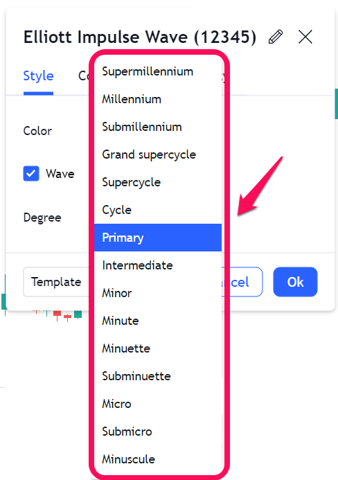 Để có được sự thống nhất trong việc quan sát và ghi chú đang xem xét sóng lớn và nhỏ ra sao, West Sussex và John Wiley từ năm 1999 đã lập một quy chuẩn để ghi chú. Cho đến nay quy chuẩn này vẫn được áp dụng, bạn có thể dễ dàng sử dụng nó trên TradingView.