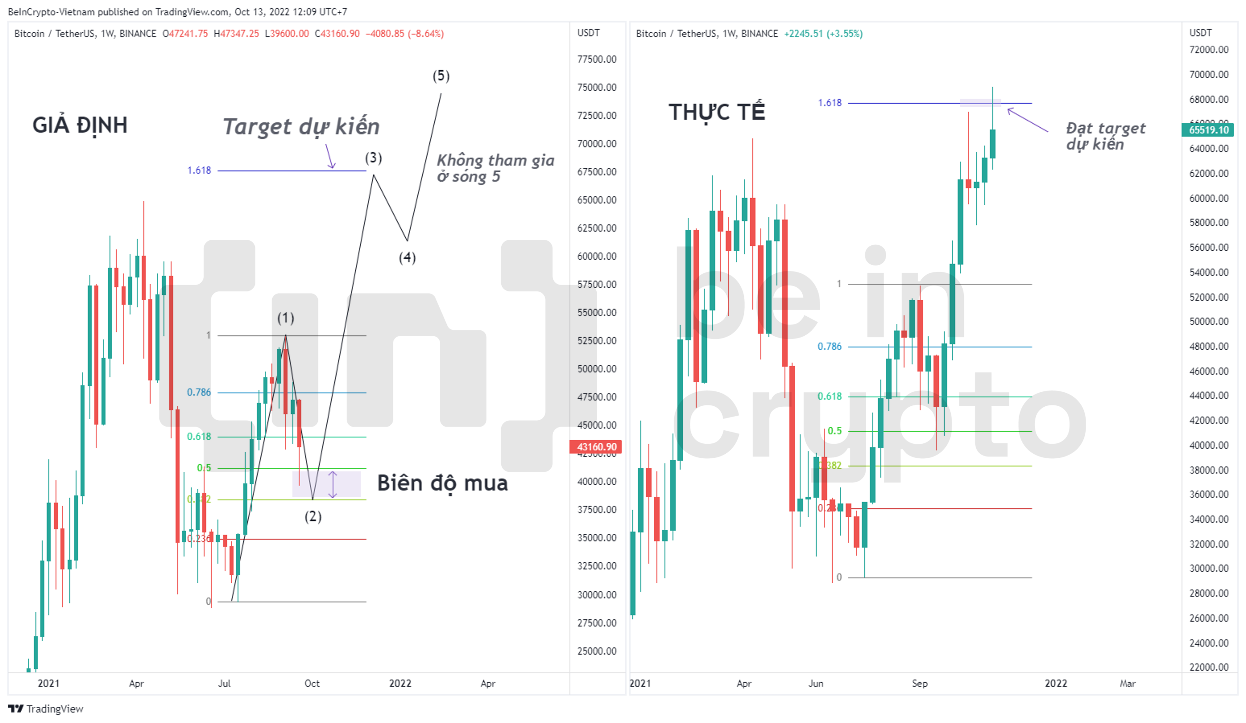 - Với cách dùng thước Fibonacci như trên, thì mức target cần phải thoát là target tỷ lệ vàng 1.618. Có thể thấy, dù giá chưa chạy hết nhưng Fibonacci đã chỉ ra kháng cự mạnh nằm ở đâu đó gần 70,000 USD.
