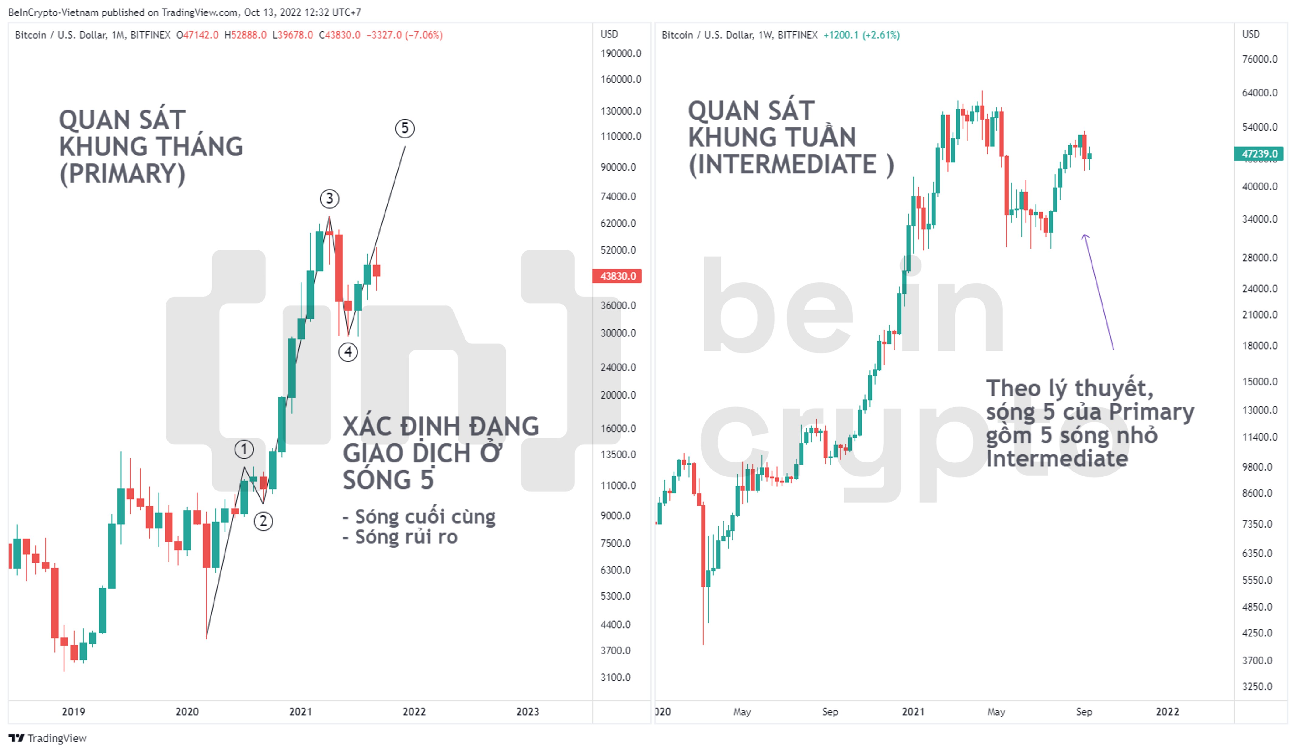 Thế nên, chúng ta thu hẹp tầm quan sát Bitcoin về khung tháng (Monthly) để xác định xu hướng chính (Primary) và quan sát khung tuần (Weekly) để xác định xu hướng trung cấp (Intermediate).
