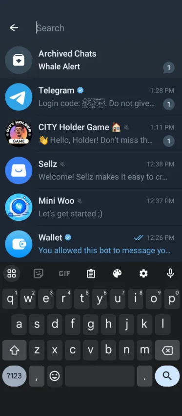5. Mở thanh tìm kiếm và tìm ứng dụng nhỏ trên Telegram.