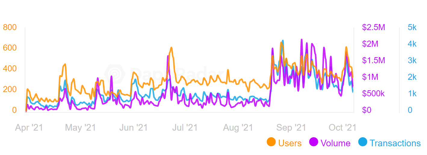 Dapp phổ biến nhất trên Tezos là QuipuSwap. Đây là một sàn giao dịch phi tập trung (DEX) và là nhà tạo lập thị trường tự động (AMM), tương tự như Uniswap. Tuy nhiên, khối lượng giao dịch của QuipuSwap chỉ là một phần rất nhỏ so với Uniswap, chỉ dưới một triệu.