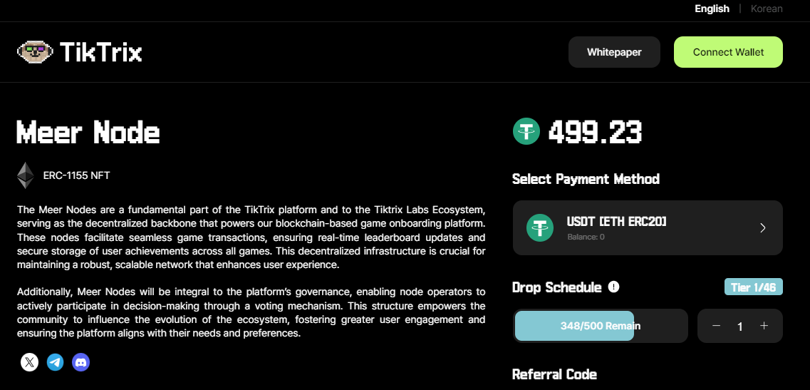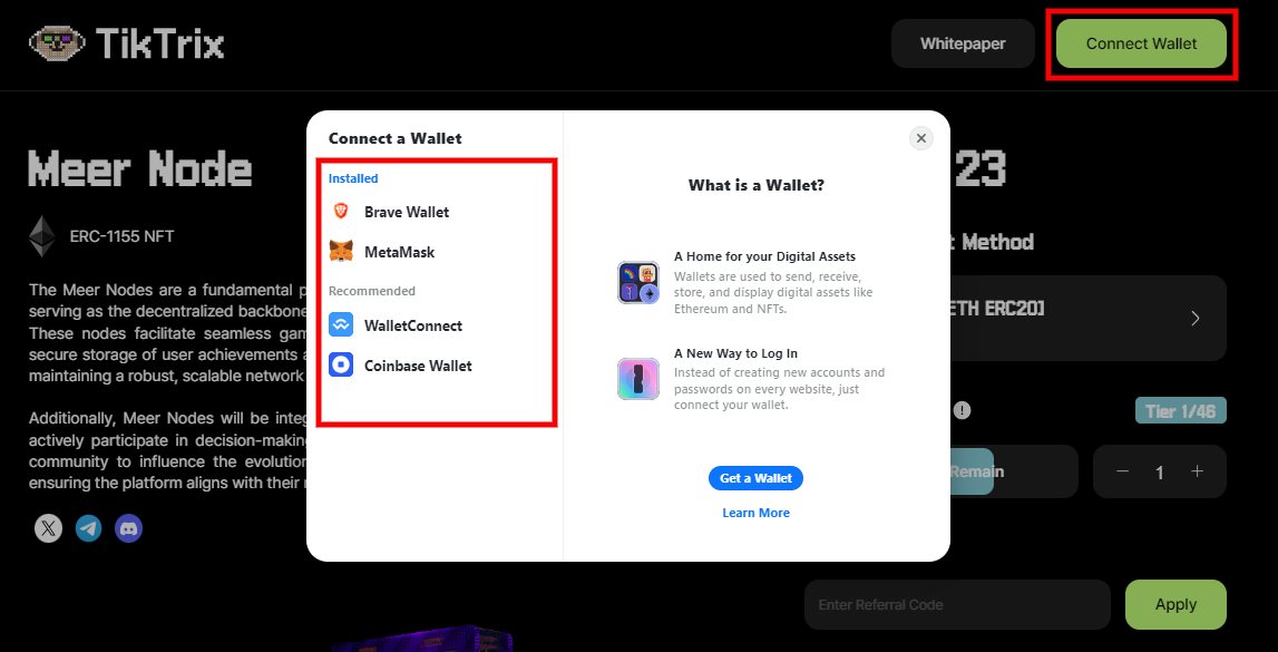 ➤ Để mua một Meer Node, người dùng cần thiết lập ví, thêm tiền điện tử và mua nút thông qua trang web TikTrix.