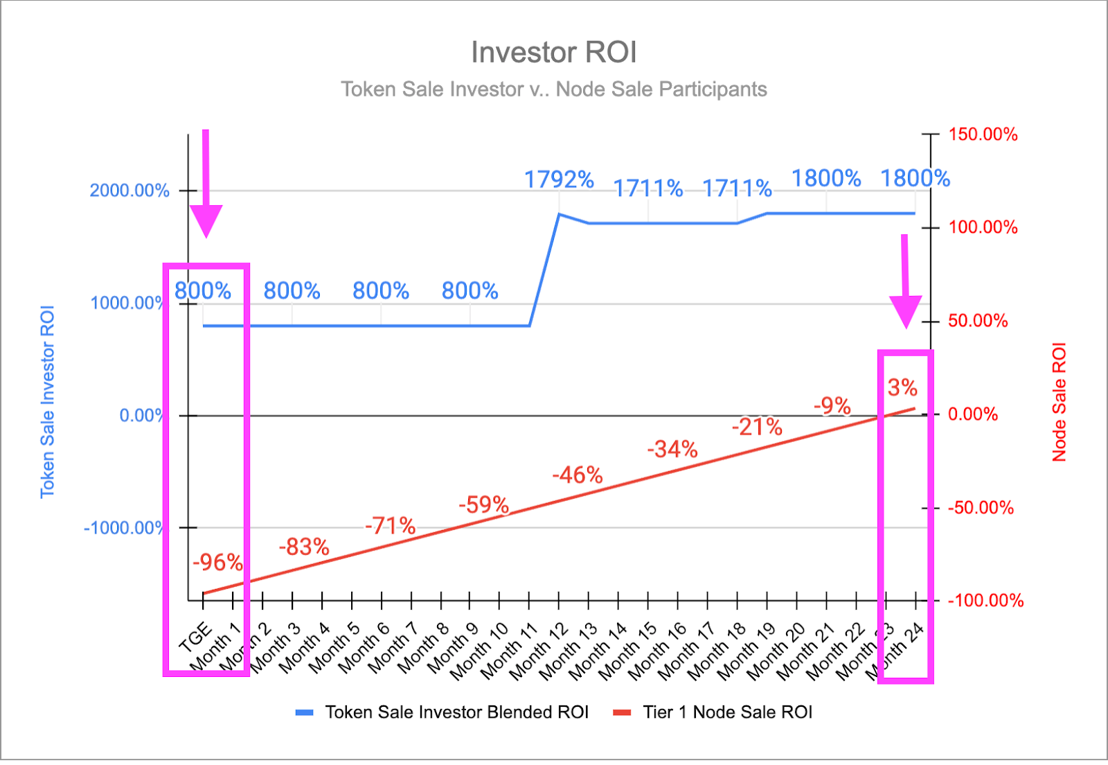 Ví dụ, biểu đồ bên dưới so sánh lợi tức đầu tư (ROI) giữa mô hình bán token với mô hình bán node vào năm 2024. Theo nghiên cứu, ROI của những người tham gia bán node thấp hơn nhiều và hòa vốn muộn hơn nhiều so với bán token.