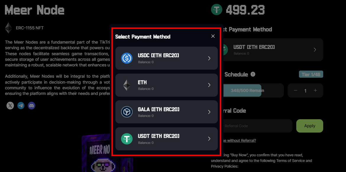 Bạn sẽ cần tiền điện tử để mua Meer Node của mình. TikTrix chấp nhận 4 loại tiền điện tử khác nhau để thanh toán: USDC (ETH ERC-20); USDT (ETH ERC-20); Ether (ETH); Gala (GALA).