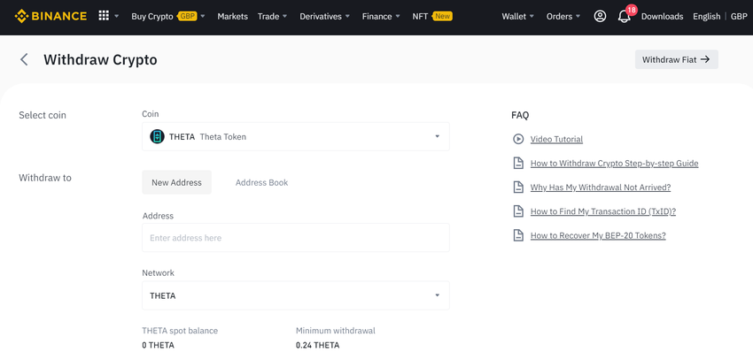 Nhập địa chỉ ví của bạn trên Binance và số tiền bạn muốn rút. Ở đây, chúng tôi không có bất kỳ theta nào, vì vậy tùy chọn này không hiển thị.