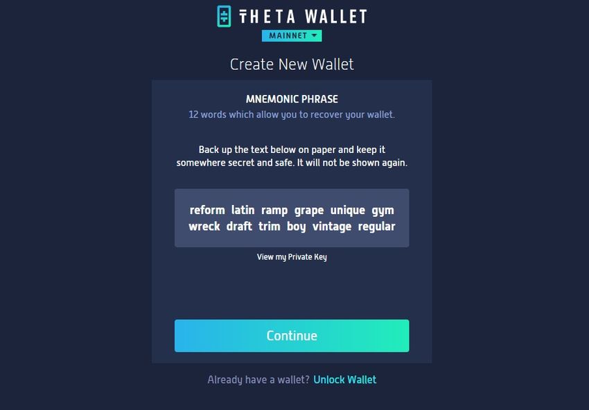 Để stake THETA, bạn sẽ cần một ví THETA. Bạn có thể đăng ký bằng cách truy cập thetatoken.org, nhấp vào “Wallet” ở đầu trang và “Create Wallet” trên trang tiếp theo. Sau đó, trang web sẽ hiện các yêu cầu của quy trình đăng ký tài khoản, yêu cầu bạn tạo mật khẩu.