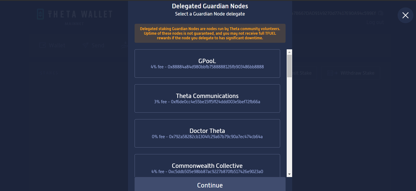 Dường như là trừ khi bạn có nhiều token THETA, lựa chọn tốt nhất là stake vào Delegated Guardian Node. Khi bạn đã chọn một nút để ủy quyền đặt cược và xác nhận số tiền đặt cược, bạn có thể cần phải chấp thuận giao dịch.