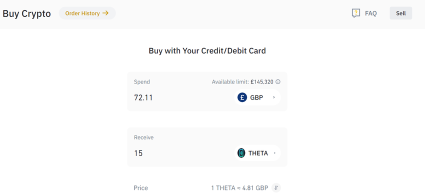 Đầu tiên, chọn phần “Buy Crypto” trên trang web Binance và chọn theta trong hộp “Receive” từ tùy chọn. Nhập số lượng mã thông báo bạn muốn mua. Đối với ví dụ này, chúng tôi nhập 15 (tối thiểu của Binance). Nhưng số tiền tối thiểu để stake là 1,000.