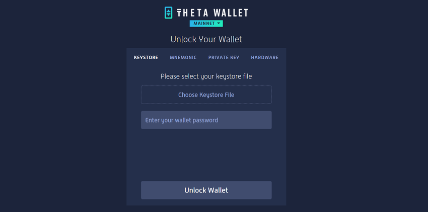 Tiếp theo, tìm địa chỉ ví THETA của bạn bằng cách truy cập wallet.thetatoken.org và đăng nhập bằng cách tải lên tệp Keystore mà bạn đã tạo và tải xuống trước đó, nhập mật khẩu ví. Tiếp theo nhấp vào “Unlock Wallet”. Ở trang tiếp theo , nhấp vào “Receive” và sao chép địa chỉ ví.