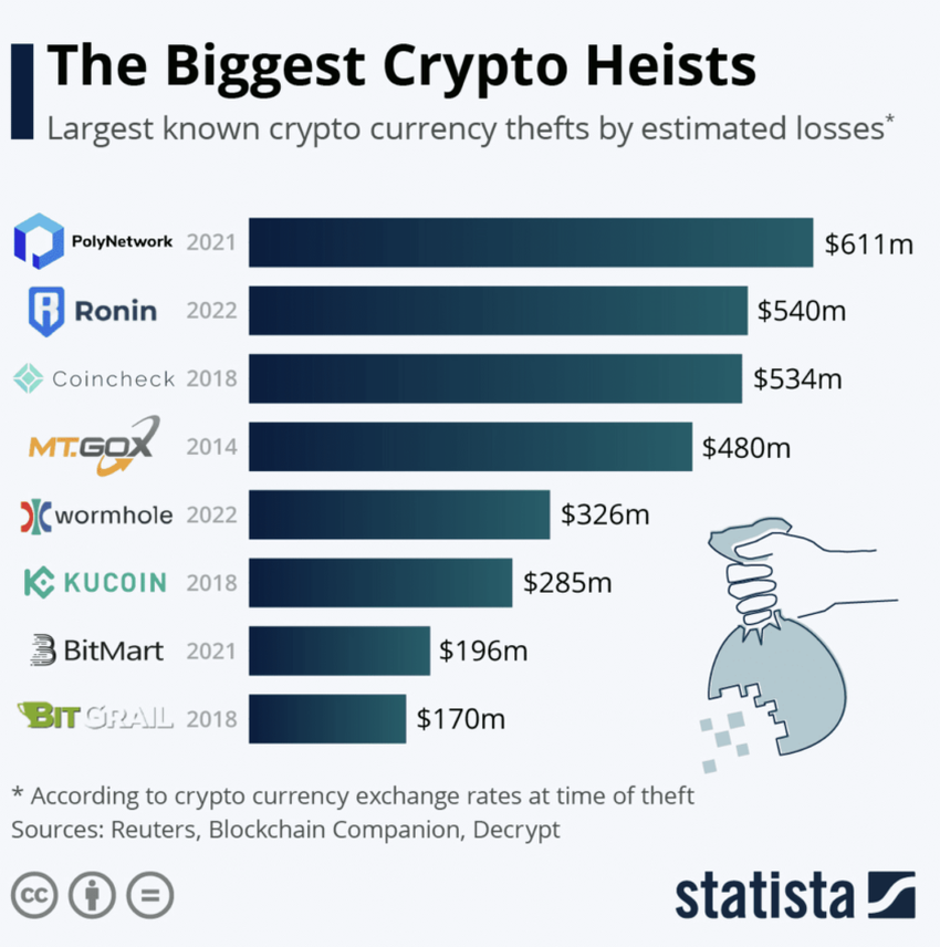 Những rủi ro về hợp đồng thông minh đầy lỗi cho đến rug pull và phần mềm độc hại (malware), tiền điện tử – là tiền có thể lập trình – thường trở thành nạn nhân của tội phạm tài chính hay hacker. Đáng chú ý là Wormhole Bridge, Nomad Bridge, Ronin Network và những mạng khác đã bị hack vào năm 2022.