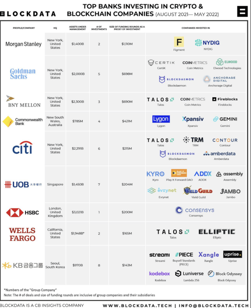Mặc dù một số ngân hàng Mỹ đóng cửa, mối tương quan giữa ngân hàng và tiền điện tử nói chung dường như vẫn vững chắc. Các tổ chức tài chính truyền thống hàng đầu đã đầu tư đáng kể vào công nghệ blockchain và các công ty tập trung vào tiền điện tử. Dưới đây là danh sách từ Blockdata về các khoản đầu tư chính được thực hiện bởi BNY Melon và Citi, cùng với các ngân hàng khác.
