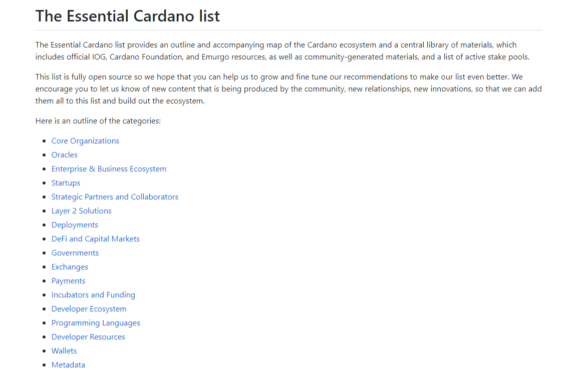 Trước khi ra mắt chính thức, Essential Cardano đã công bố một sườn (outline) và các thành phần trong hệ sinh thái Cardano. Về cơ bản thì Essential Cardano là một nguồn trung tâm cho tất cả mọi thứ trên Cardano. Đây là một kho lưu trữ mã nguồn mở được xây dựng cho cộng đồng. Theo đó, hệ sinh thái của Cardano sẽ bao gồm 29 thành phần khác nhau. Chúng bao gồm các giải pháp tầng 2, các ví lưu trữ hay các sàn giao dịch,… sẽ xuất hiện trên Cardano. Điển hình: