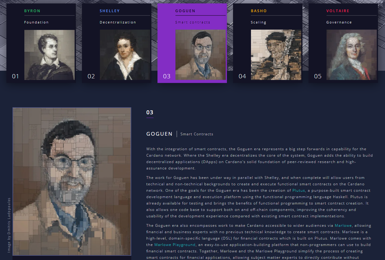 Tại thời điểm mình viết bài này, Cardano đang chuẩn bị chuyển sang giai đoạn 3 trong hành trình phát triển. Hai giai đoạn trước (Byron & Shelly) là quãng thời gian để Cardano xây dựng nền tảng. Giai đoạn 3 (Goguen) là lúc Cardano chính thức bắt đầu tiếp cận với thế giới bên ngoài. Tính năng smart contract được đưa vào mạng lưới. Đây được xem như là cầu nối cho sự xuất hiện của hàng loạt các Dapps sắp tới.