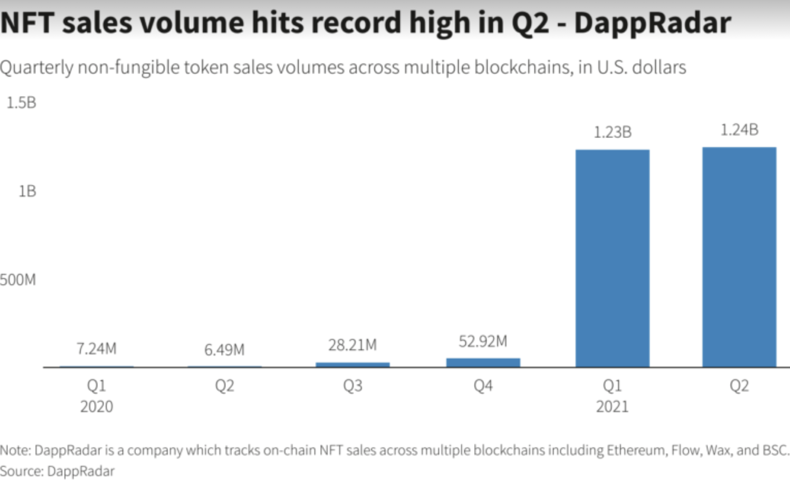 Dữ liệu của DappRadar cho thấy trong nửa đầu năm 2021, tổng doanh thu của NFT đạt 2.47 tỷ USD. Trong khi đó, nền tảng NonFungible.com ước tính con số này là 1.3 tỷ USD. Mặc dù có sự chênh lệch về con số thống kê giữa các nền tảng khác nhau nhưng điều quan trọng là các con số này tăng đáng kể so với năm trước. Theo Cloudwards, doanh số bán hàng của NFT vào năm 2020 chỉ khoảng 250 triệu USD.