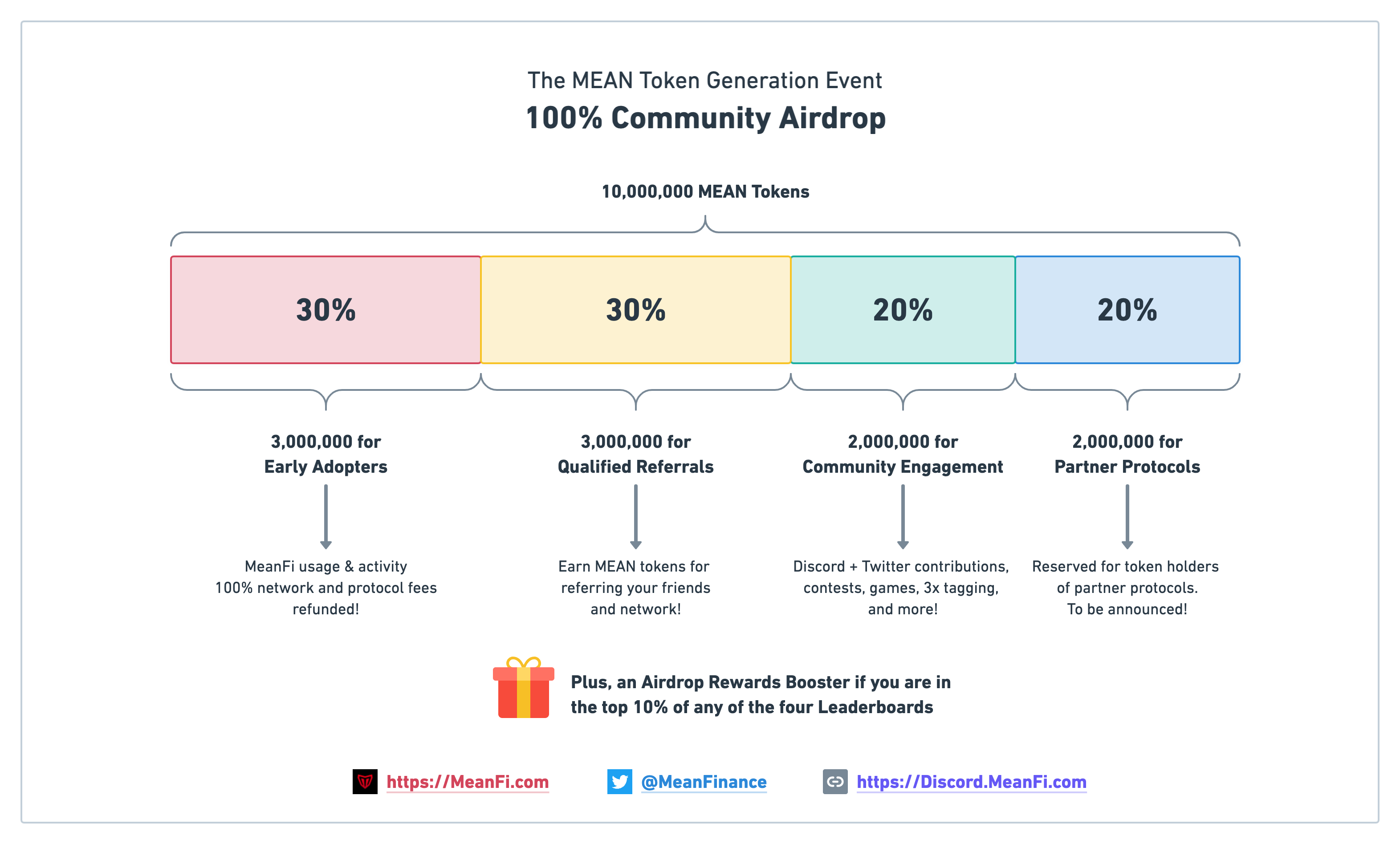 Theo lộ trình tokenomics chính thức, MeanFi đang có kế hoạch tung ra token quản trị gốc và airdrop toàn bộ nguồn cung ban đầu (10 triệu token MEAN) cho cộng đồng của mình. Hình dưới đây là cấu trúc phân phối của airdrop: