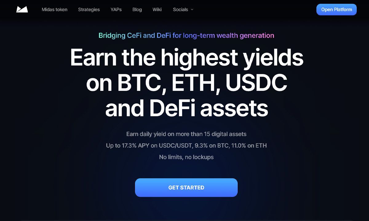 Ra mắt vào năm 2018, Midas.Investments là một nền tảng “CeDeFi” tập trung vào việc giúp người dùng tạo thu nhập thụ động. Nó cho phép họ kiếm được lợi nhuận hàng ngày trên hơn 20 tài sản kỹ thuật số. Midas.Investments hiện đang quản lý hơn 200 triệu USD tài sản của khách hàng.